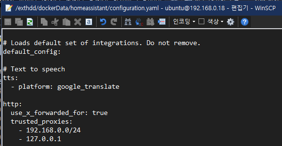 | Docker로 설치시 바로 설치화면으로 들어가지지 않고, 위와 같이 "400 error" 또는 "127.0.0.1 invalid 등의 내용이 나올 경우 Config 폴더 -> configuration.yaml 파일에 아래 내용을 추가해 주시면 됩니다. http: use_x_forwarded_for: true trusted_proxies: - 192.168.0.0/24 - 127.0.0.1 ![]() Config 폴더의 경우 위 도커에서 설정한 ex)"/exthdd/dockerData/homeassistant:/config" 위치로 가시면 됩니다. |